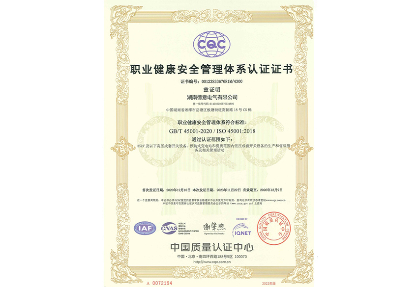 職業(yè)健康安全管理體系認證證書