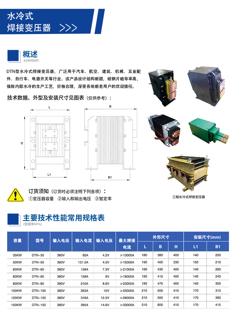 DTN型水冷式焊接變壓器,廣泛用于汽車、航空、建筑、機(jī)械、五金配件、自行車、電器開(kāi)關(guān)等行業(yè)。該產(chǎn)品設(shè)計(jì)結(jié)構(gòu)新穎,硅鋼片磁導(dǎo)率高,強(qiáng)制內(nèi)部水冷的生產(chǎn)工藝,價(jià)格合理,深受各地新老用戶的歡迎信任。